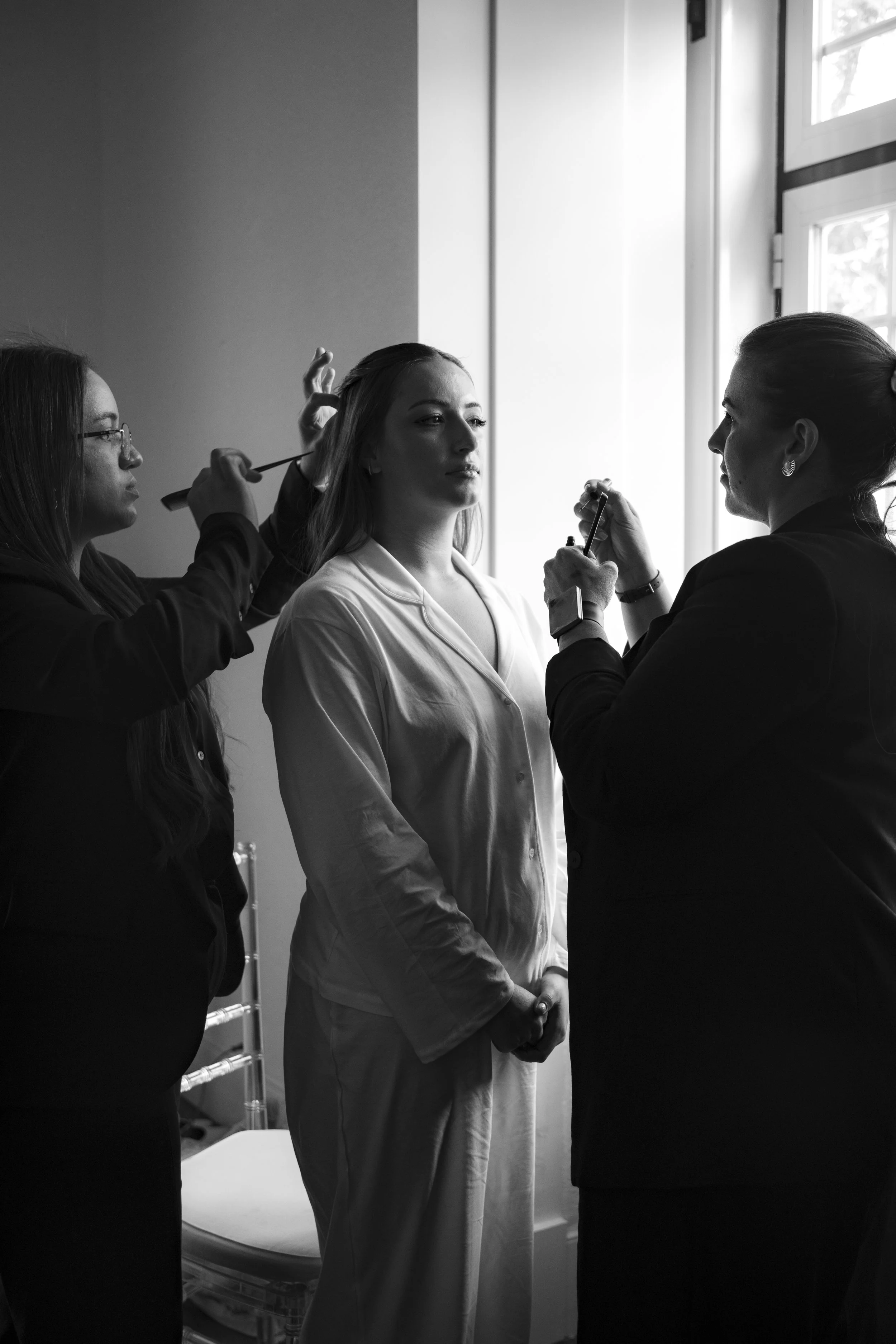 A bride getting her hair and makeup done by one makeup artists and one hairstylist from The Bridal Designers wedding team, lisbon, portugal.